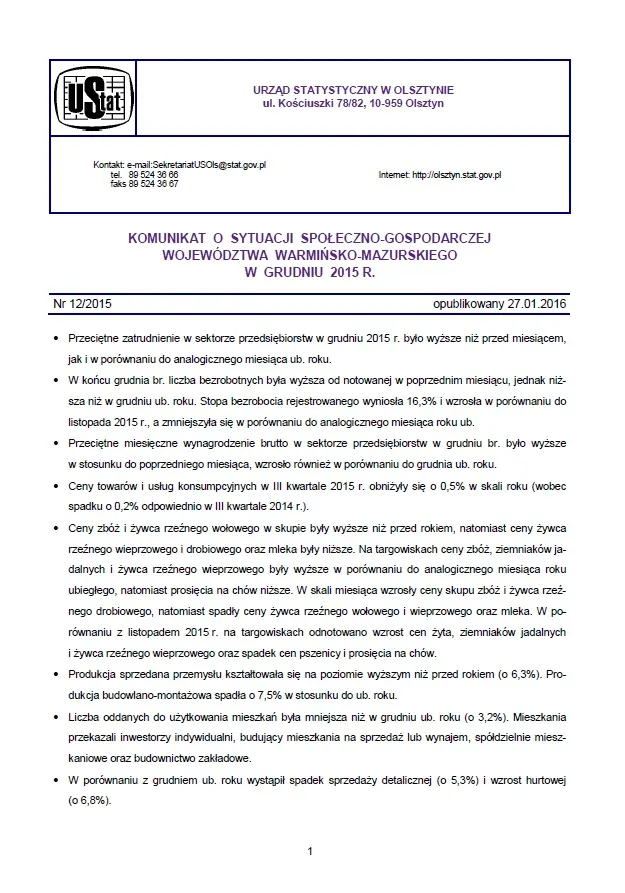 - Komunikat o sytuacji społeczno-gospodarczej województwa warmińsko-mazurskiego w styczniu 2016 r.