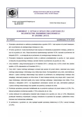 Komunikat o sytuacji społeczno-gospodarczej województwa warmińsko-mazurskiego w grudniu 2015 r.