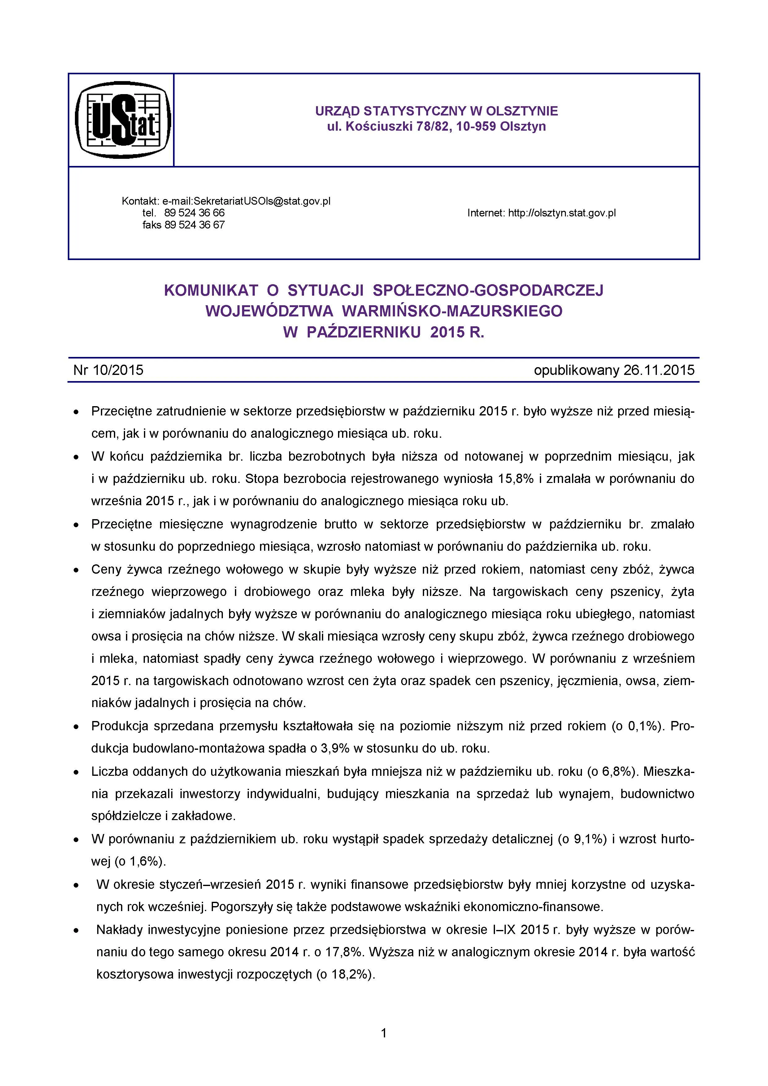- Komunikat o sytuacji społeczno-gospodarczej województwa warmińsko-mazurskiego w listopadzie 2015 r.