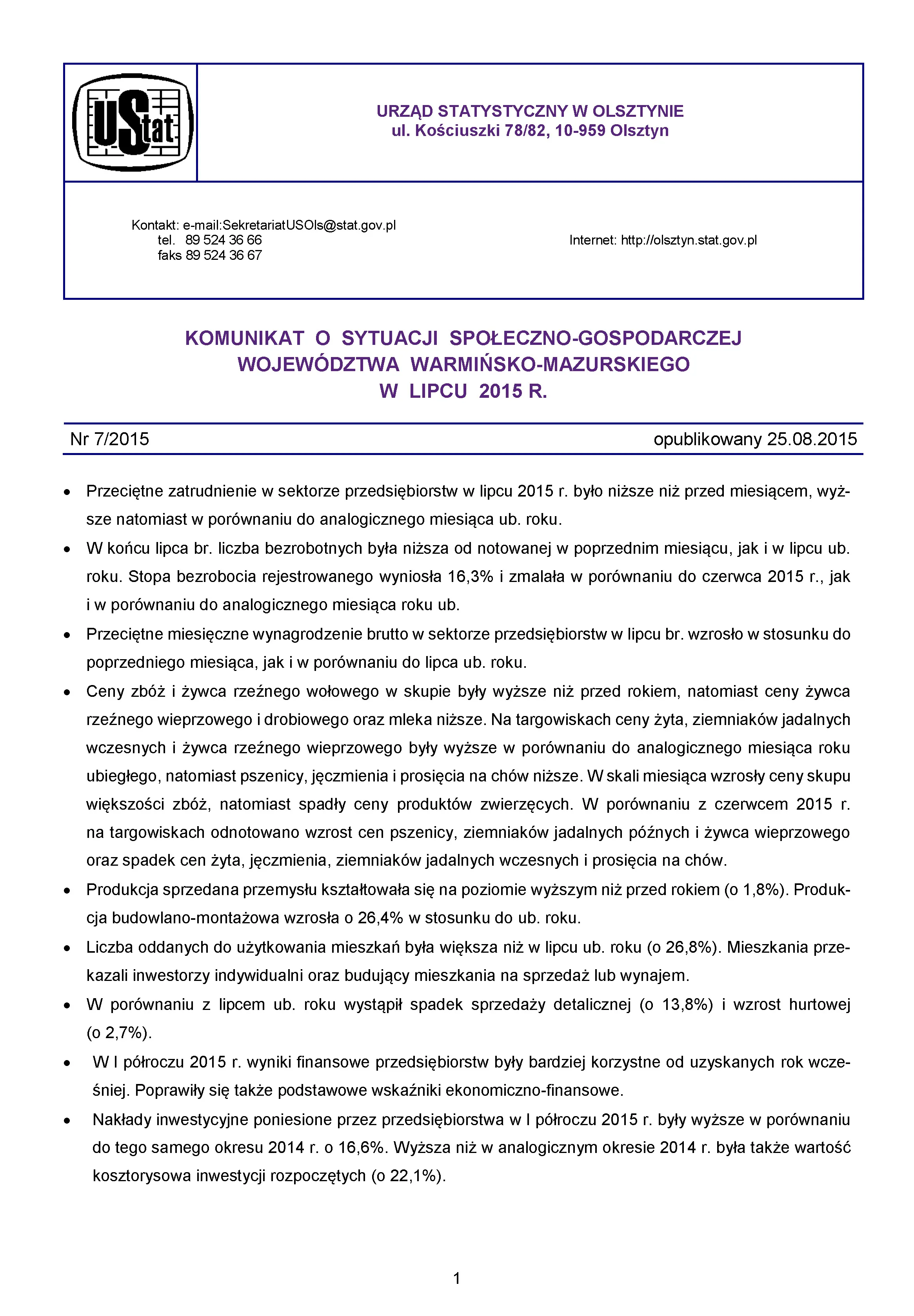 - Komunikat o sytuacji społeczno-gospodarczej województwa warmińsko-mazurskiego w sierpniu 2015 r.