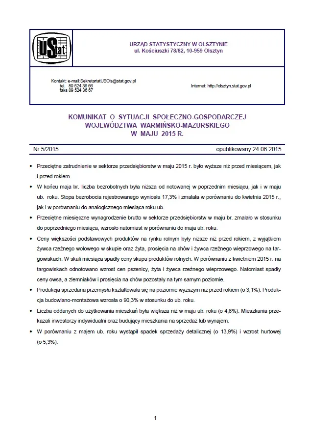 Komunikat o sytuacji społeczno-gospodarczej województwa warmińsko-mazurskiego w maju 2015 r.