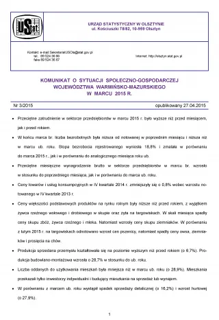 - Komunikat o sytuacji społeczno-gospodarczej województwa warmińsko-mazurskiego w kwietniu 2015 r.