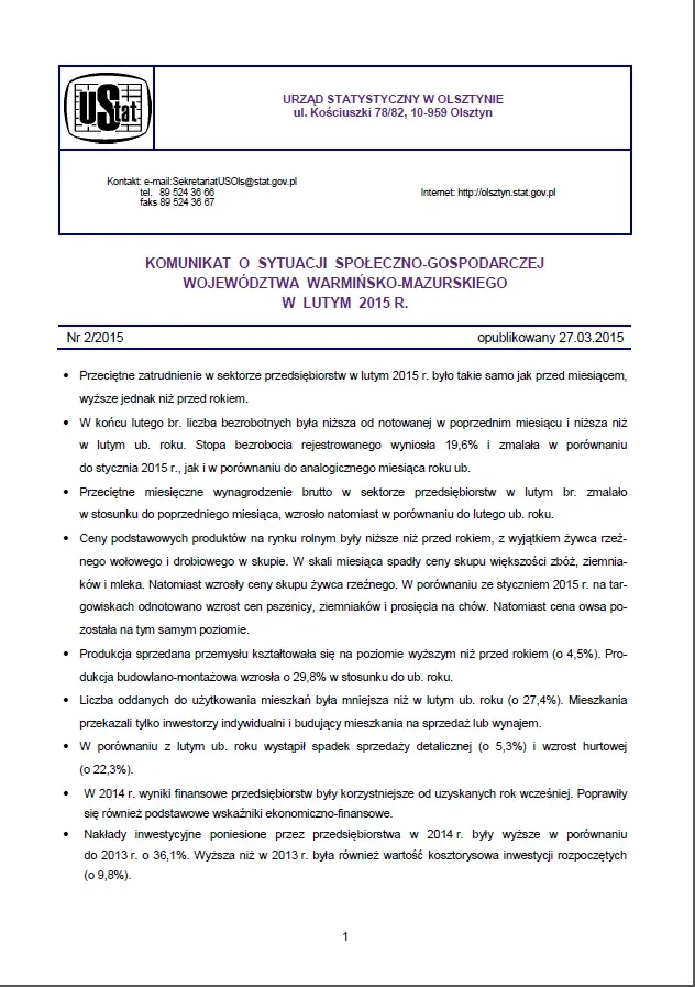 - Komunikat o sytuacji społeczno-gospodarczej województwa warmińsko-mazurskiego w marcu 2015r.