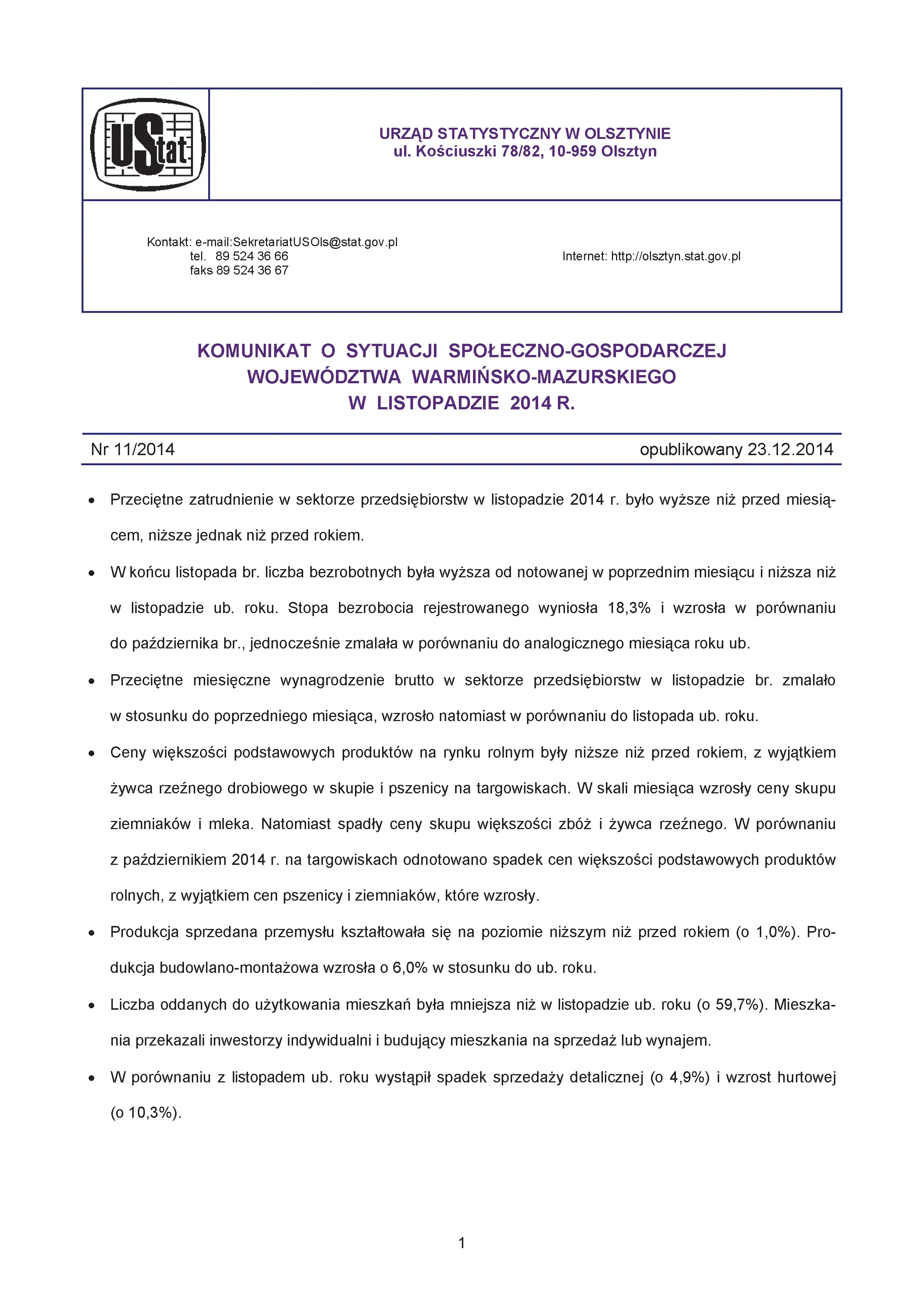 - Komunikat o sytuacji społeczno-gospodarczej województwa warmińsko-mazurskiego w grudniu 2014 r.