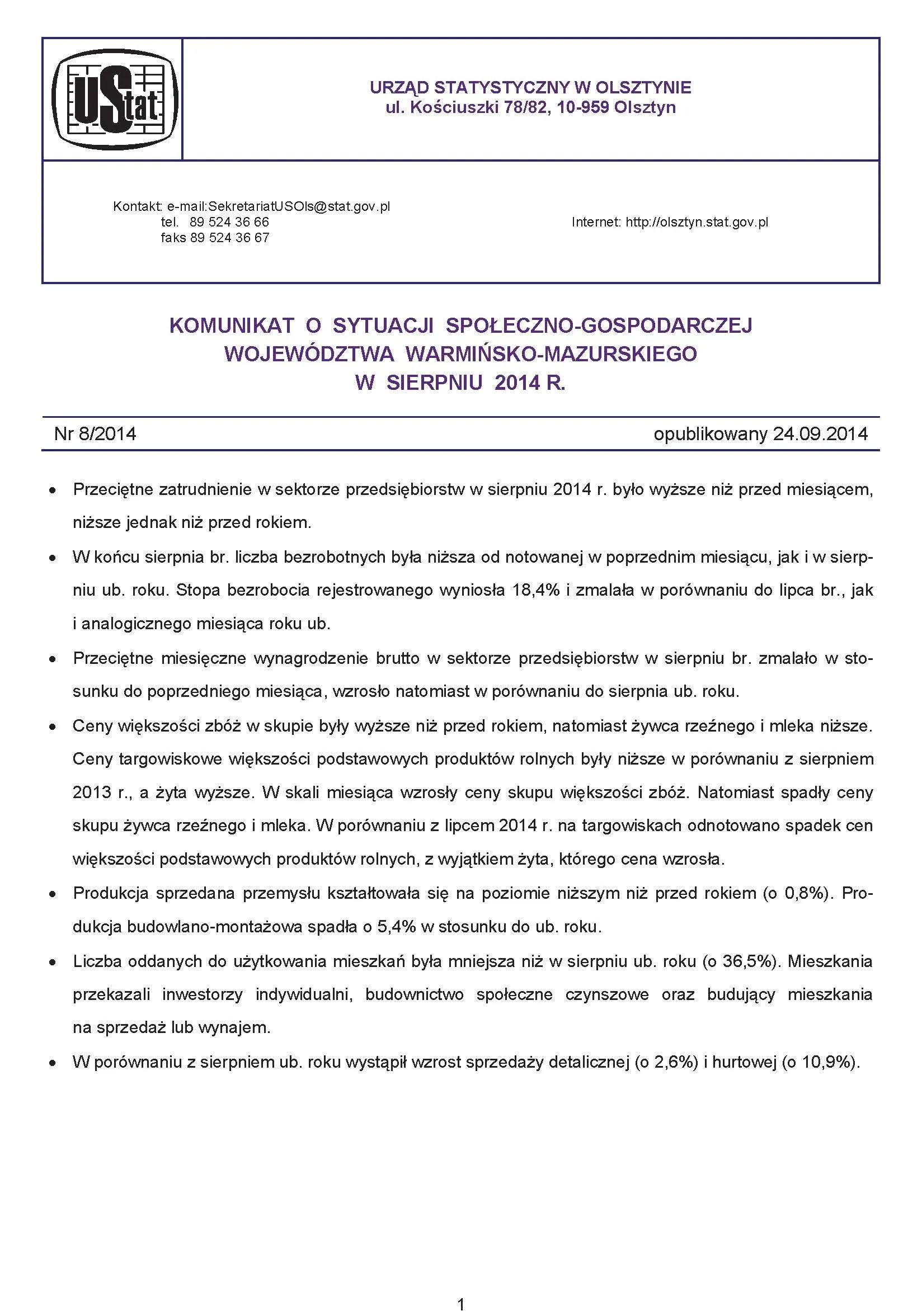 - Komunikat o sytuacji społeczno-gospodarczej województwa warmińsko-mazurskiego we wrześniu 2014 r.