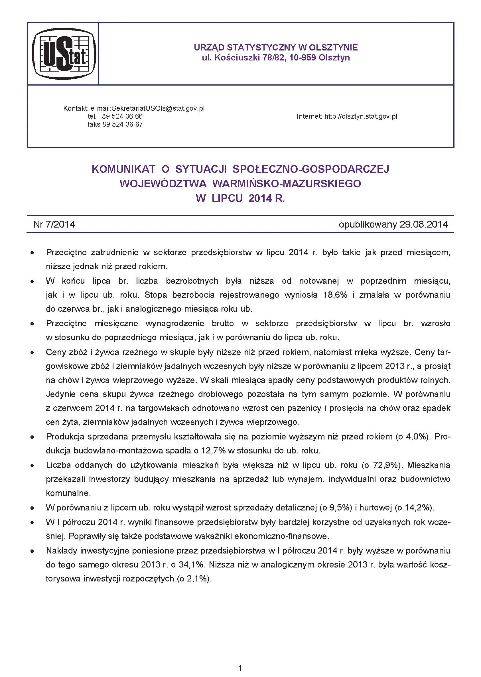 - Komunikat o sytuacji społeczno-gospodarczej województwa warmińsko-mazurskiego w sierpniu 2014 r.