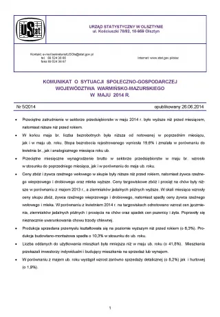 Komunikat o sytuacji społeczno-gospodarczej województwa warmińsko-mazurskiego w maju 2014 r.