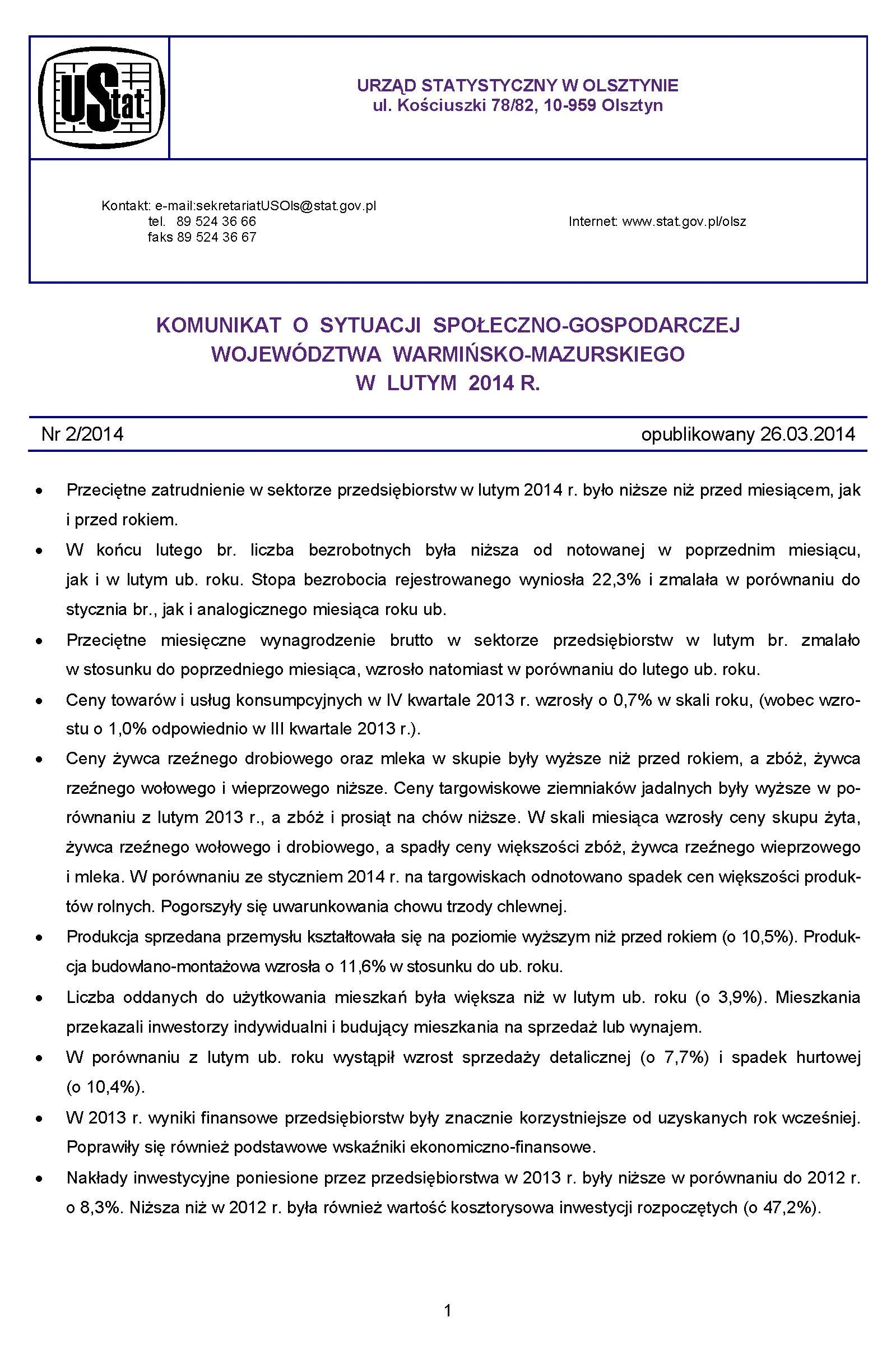 - Komunikat o sytuacji społeczno-gospodarczej województwa warmińsko-mazurskiego w marcu 2014 r.