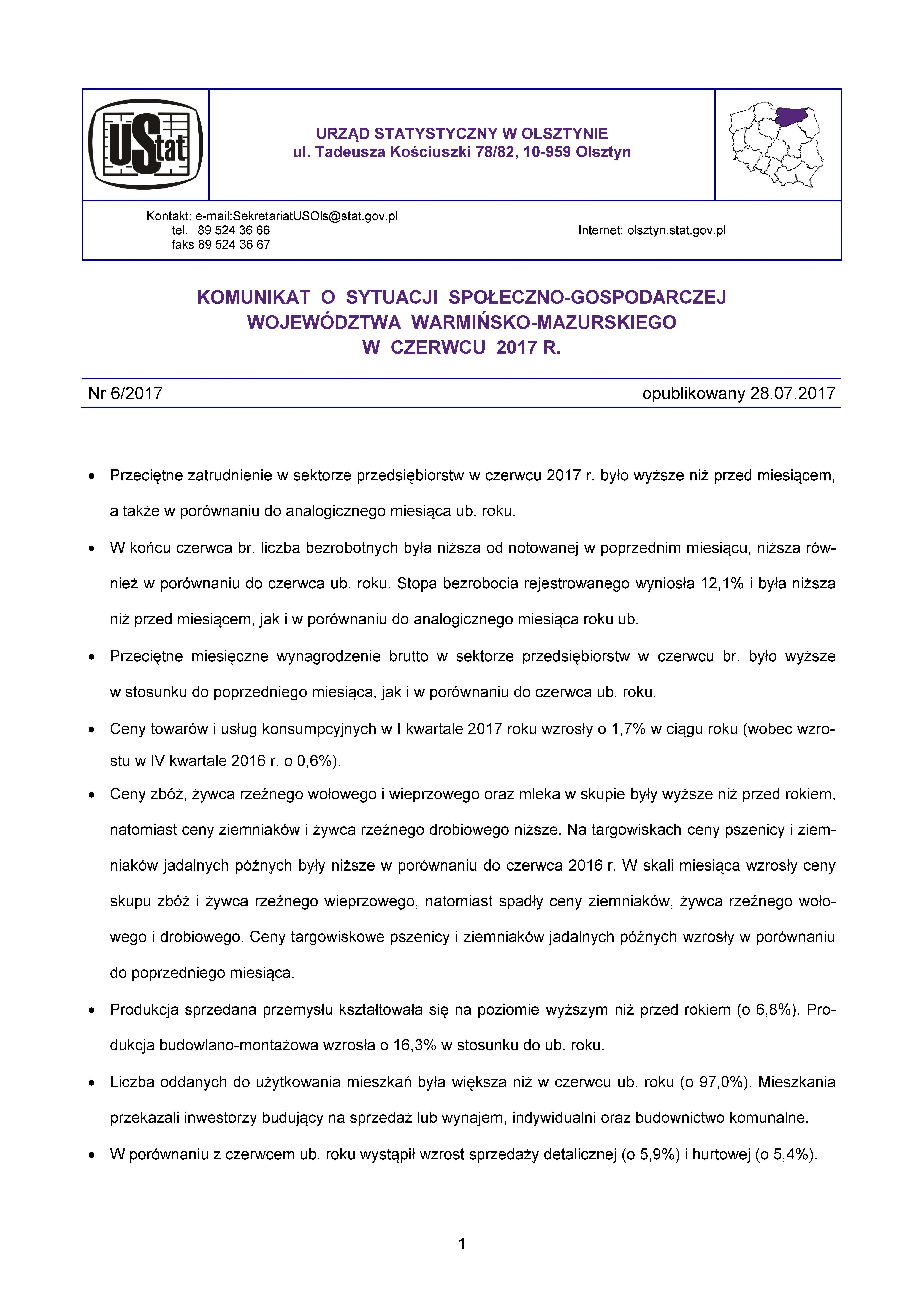 - Komunikat o sytuacji społeczno-gospodarczej województwa warmińsko-mazurskiego w lipcu 2017 r.