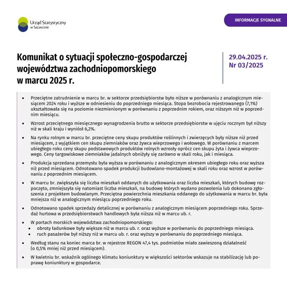 Komunikat o sytuacji społeczno-gospodarczej województwa zachodniopomorskiego - marzec 2025 - Informacja sygnalna