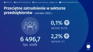 W czerwcu 2022 r. przeciętne zatrudnienie w sektorze przedsiębiorstw w porównaniu z czerwcem 2021 r. było wyższe o 2,2% i wyniosło 6496,7 tys. etatów. W stosunku do poprzedniego miesiąca przeciętne zatrudnienie zwiększyło się minimalnie (o 0,1%).