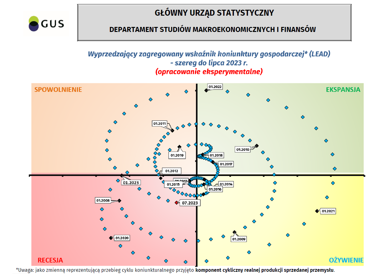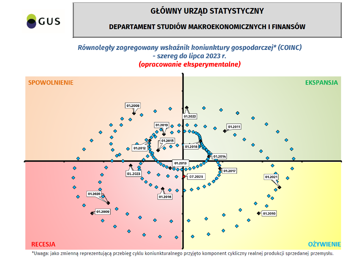 Równoległy oraz wyprzedzający zagregowany wskaźnik koniunktury, zegar koniunktury - szereg do lipca 2023 r.