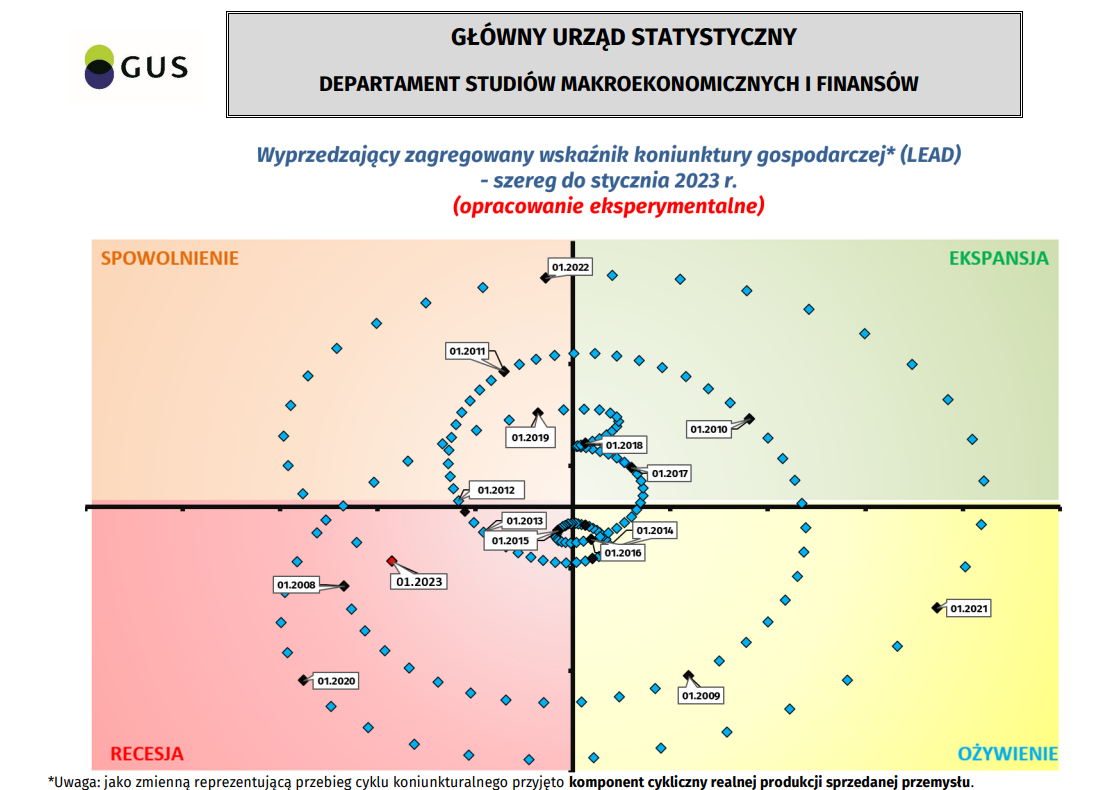 Równoległy oraz wyprzedzający zagregowany wskaźnik koniunktury, zegar koniunktury - szereg do stycznia 2023 r.