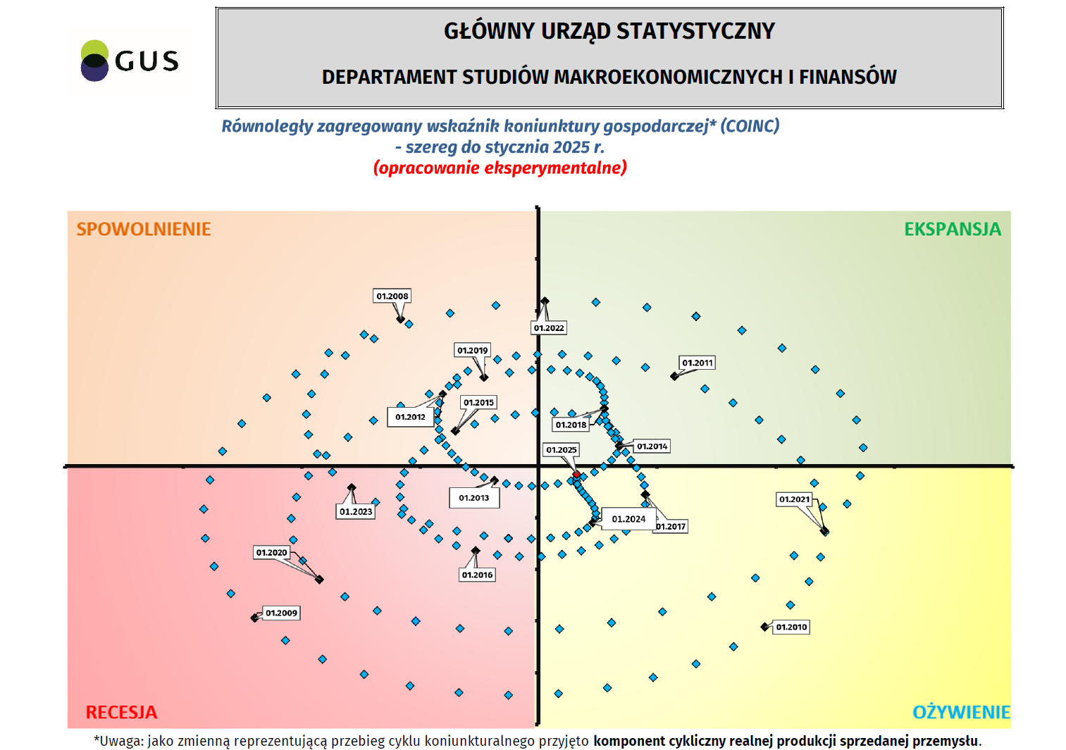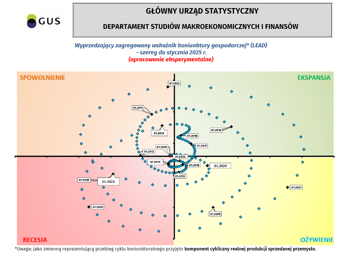 Równoległy oraz wyprzedzający zagregowany wskaźnik koniunktury, zegar koniunktury - szereg do stycznia 2025 r.