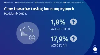 Ceny towarów i usług konsumpcyjnych w październiku 2022 r. w porównaniu z analogicznym miesiącem ub. roku wzrosły o 17,9% (przy wzroście cen towarów – o 19,5% i usług – o 13,0%). W stosunku do poprzedniego miesiąca ceny towarów i usług wzrosły o 1,8% (w tym towarów – o 2,1% i usług – o 0,7%).
